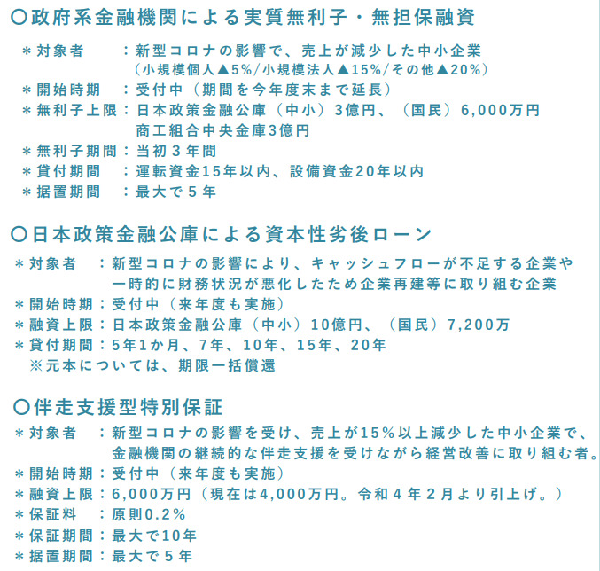 政府系金融機関(日本政策金融公庫や商工中金)の実質無利子・無担保融資が引き続き実施される見通しです。無利子・無担保でお金を借りられるケースは多くないため、普段借入を余り実施しない事業者の方でも、中小企業診断士の立場からは借り入れを申し込んでみることをお勧めしています。何かあったときにどれだけ手元資金が厚いか、が、生死を左右することも多くありますので、借入も引き続き検討してみてくださいね。