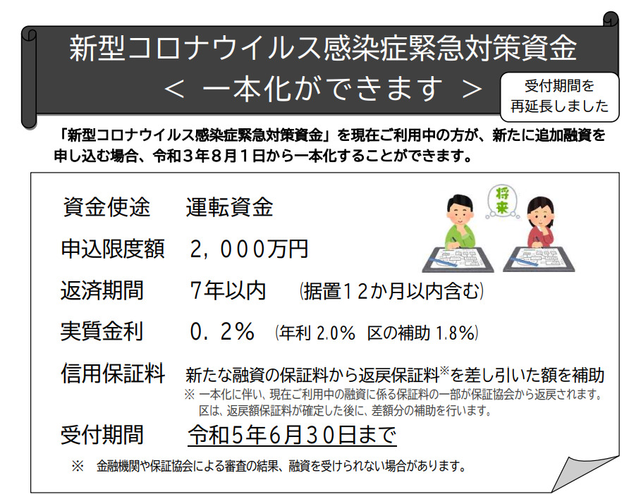 令和3年7月31日以前に「新型コロナウイルス感染症緊急対策資金」をご利用の方は、追加で「新型コロナウイルス感染症緊急対策資金」のあっせんを申し込む際に、既存の「新型コロナウイルス感染症緊急対策資金」と一本化することができます。
