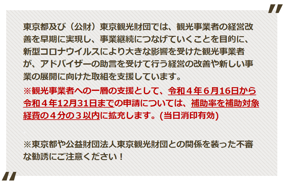 【東京都】アドバイザーを活用した観光事業者の支援事業補助金の公募【観光業向け】 | 東京都墨田区のホームページ・デザイン・イラスト制作会社 TenCy株式会社