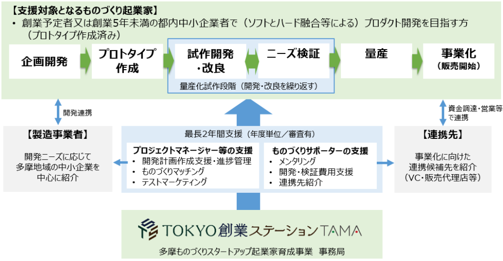 東京都が運営する創業支援拠点「TOKYO創業ステーションTAMA」では、ものづくり起業家の掘り起こしを行い、既存の中小製造業等との連携を促進し、次世代のスタートアップ起業家へと育成することで、創業機運を醸成、ものづくりスタートアップ起業家を輩出することを目的とする起業家育成支援事業を実施しています。