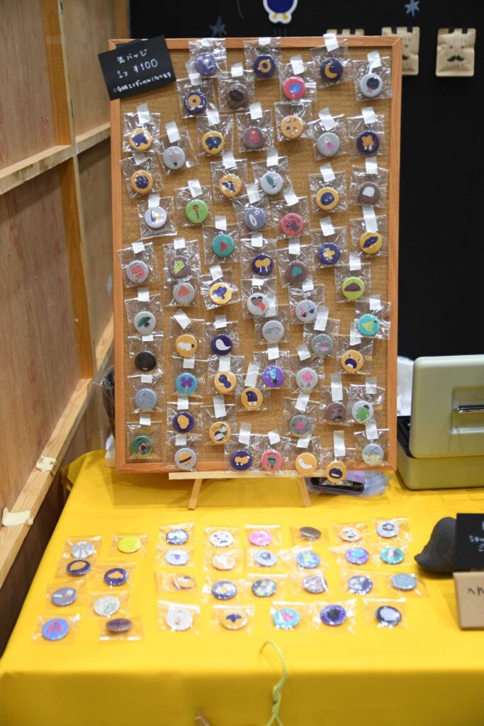 過去の出展時に用意した棚や、今回の缶バッジレイアウトに用意したボード、背景の装飾など、ブース内の雰囲気をへんてこに演出できたのではと思います。