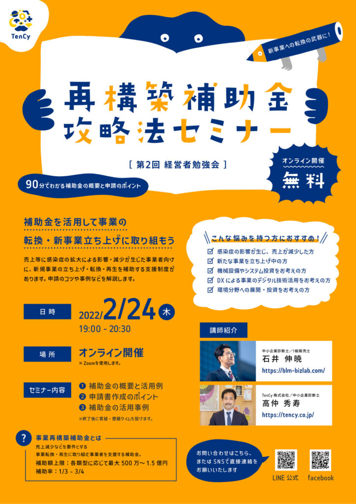 2022年2月24日、中小企業診断士の石井先生とTenCy株式会社の共催で経営者勉強会を開催しました!第二回となる開催も、まん延防止措置を踏まえてZoomオンラインによる開催となりました。テーマは「事業再構築補助金」で、申請のコツや攻略法と、具体的な申請事例等を紹介させて頂きました。