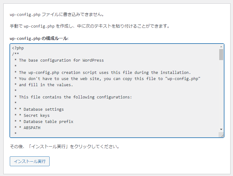 でました!ここまでくれば、後はWordPressの標準的な作業になってくるはず…と思いきや、まだ見慣れない画面が表示されます。これは、ApacheがWordPressファイルへの書き込みを行う権限が無いことによるエラーが原因です。権限を変更しておきましょう。