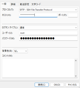 FileZilla に取得済みのIPアドレスとrootアカウント情報を設定することで、SFTPアクセスができるようになります。プロトコルをSFTPにするのを忘れないでくださいね。