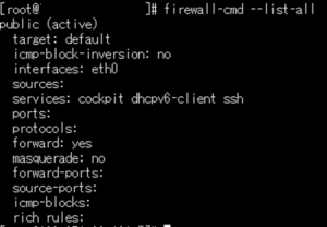 firewall-cmd --list-allで設定を確認してみると、http / https のアクセスがブロックされていることが分かります。
