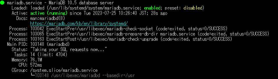 systemctl start mariadbこちらも自動起動する設定をして、さっそくMariaDBを起動してみます。起動できているかどうかの確認コマンドは systemctl status です。mariadbだけでなくhttpd など他のサービスにも使用できます。