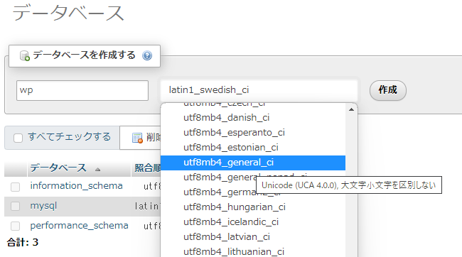 公式に従って、utf8mb4_general_ci を選択します。ユーザーの追加は、とりあえず後回しで良いかな。