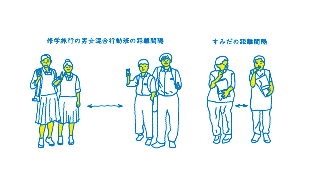 中学生の頃の修学旅行での行動班で、男女の距離間隔が絶妙に開いていました。おそらく内的距離も外的距離も埋まらない溝だったのですが、すみだ区の距離間隔は密接距離に近いものがありました。
