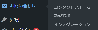 Contact Form 7を利用していると、サイドメニューに「お問い合わせ」というメニューが追加されています。メニューにマウスを当てると、インテグレーションのメニューが表示されるので選択しましょう。