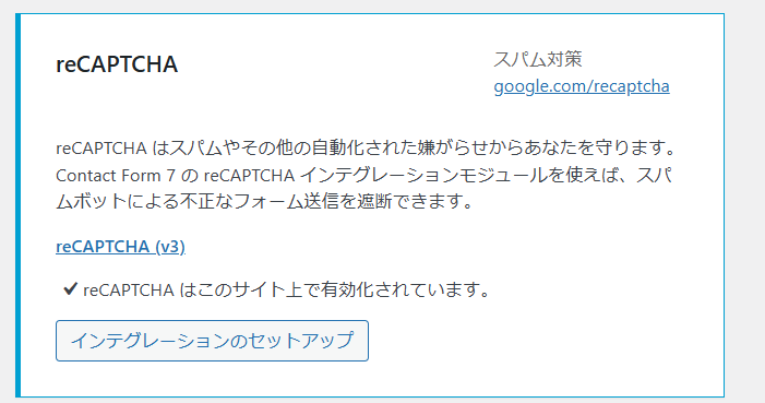 インテグレーションのメニューを開くと、3番目のセクションにreCAPTCHAを設定する箇所があります。サイトキーとシークレットキーを設定して保存すると、添付図のように有効化されている、と表示されます。