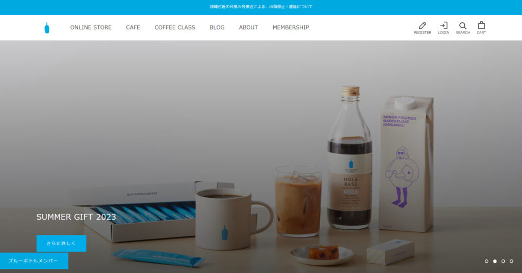 デザインはブルーボトルのロゴを意識した水色と白が基調のシンプルなデザインで、見やすさや実店舗の世界観との整合性を意識したページとなっている印象です。