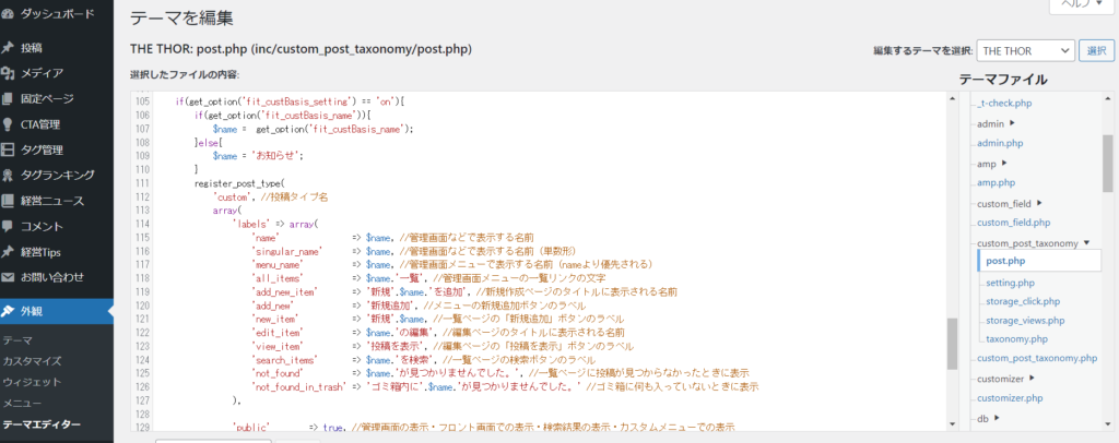 テーマの編集画面になったら、親テーマ「The Thor」の inc フォルダ内にある post.php を選択します。