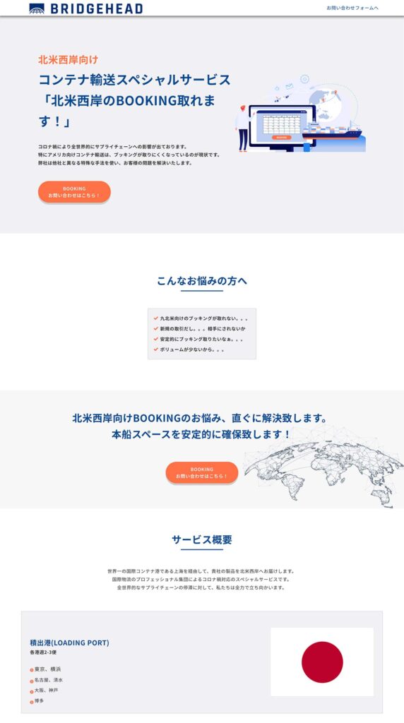 コロナ禍によるサプライチェーンへの影響が出る中、北米向けにコンテナ輸送の安定的なブッキングを取るためのサービスです。ランディングページとしては輸出入貨物の取り扱い紹介のLP制作とセットで実施しました。コーポレートカラーでもある濃紺を意識し、港湾業務・海運業界のプロフェッショナルを感じられるようなデザインを意識して制作しました。