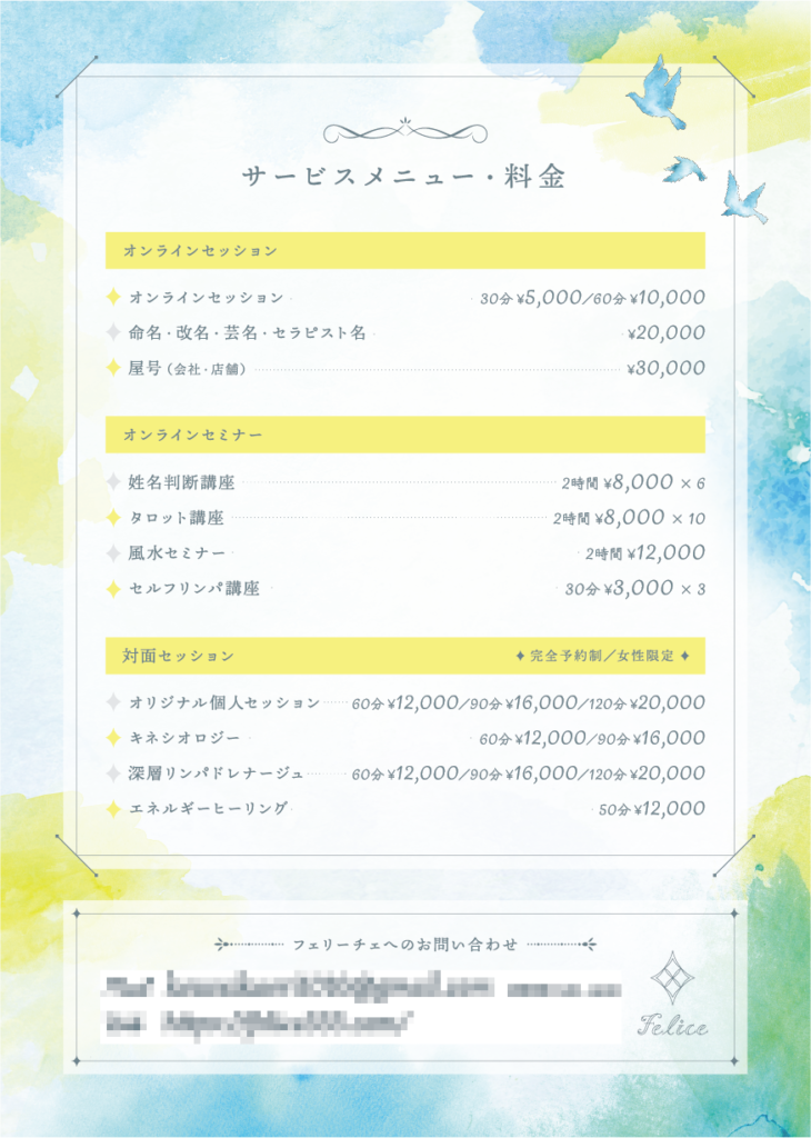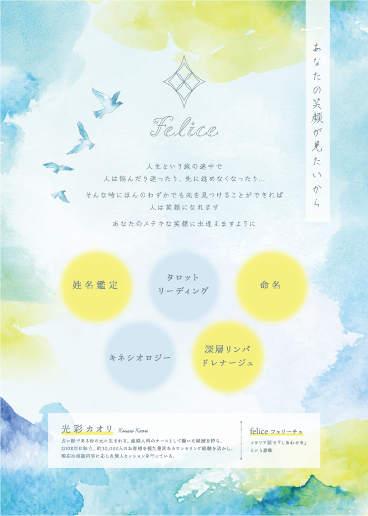 株式会社フェリーチェ が提供するオンラインセッション・対面セッション等のサービスチラシのデザインを担当しました。