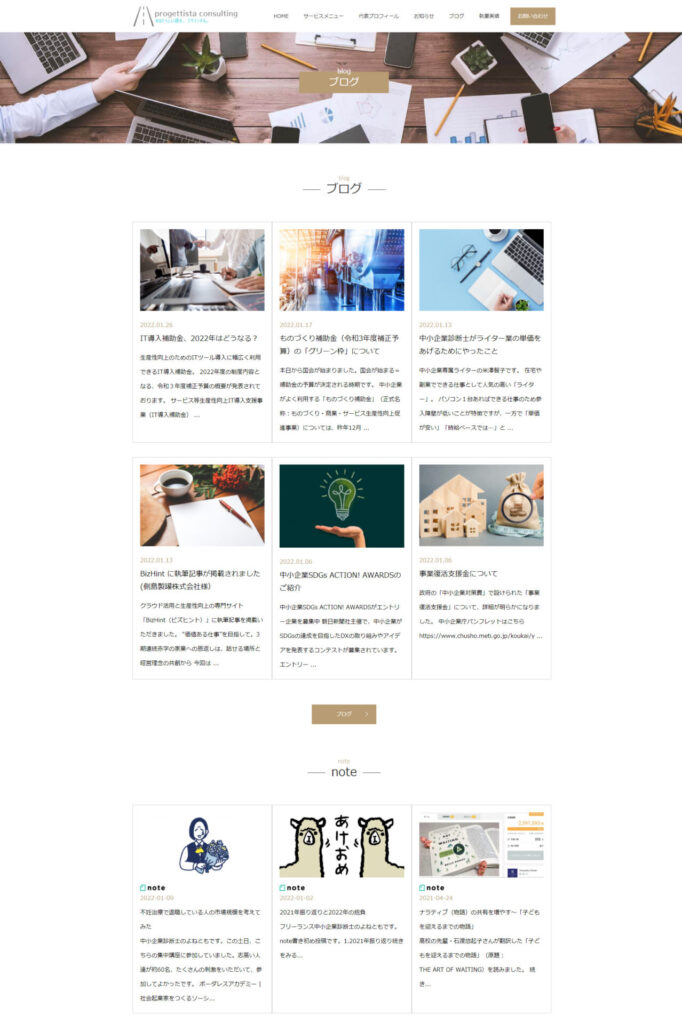 ブログページにおいては、別で運用されているブログ「小さな企業の強みを伸ばす!経営情報マガジン」とnote記事のRSS配信を取得し、サムネイル画像も表示するようにPHPカスタマイズを実施しています。