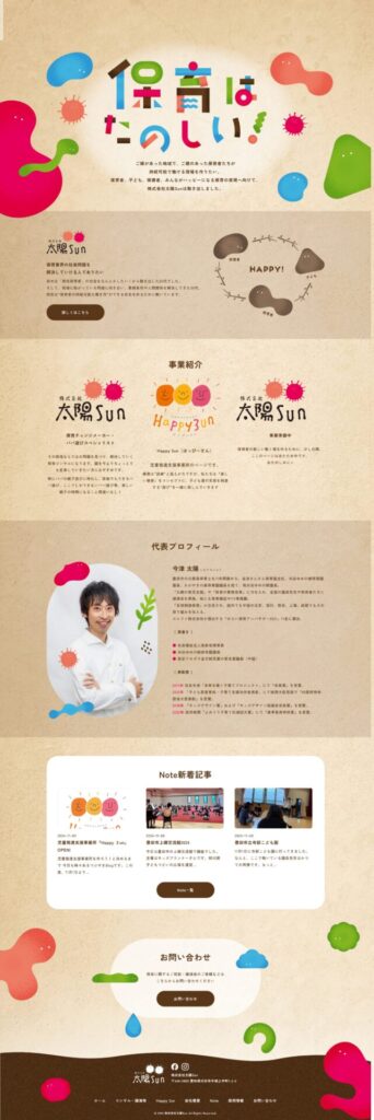 保育コンサル・児童発達支援事業所の運営などを行う株式会社太陽sun様のホームページを制作しました。太陽sun様のロゴコンセプトに合わせて、Happyな気持ちになれるようなサイトデザインを意識して制作を行いました。