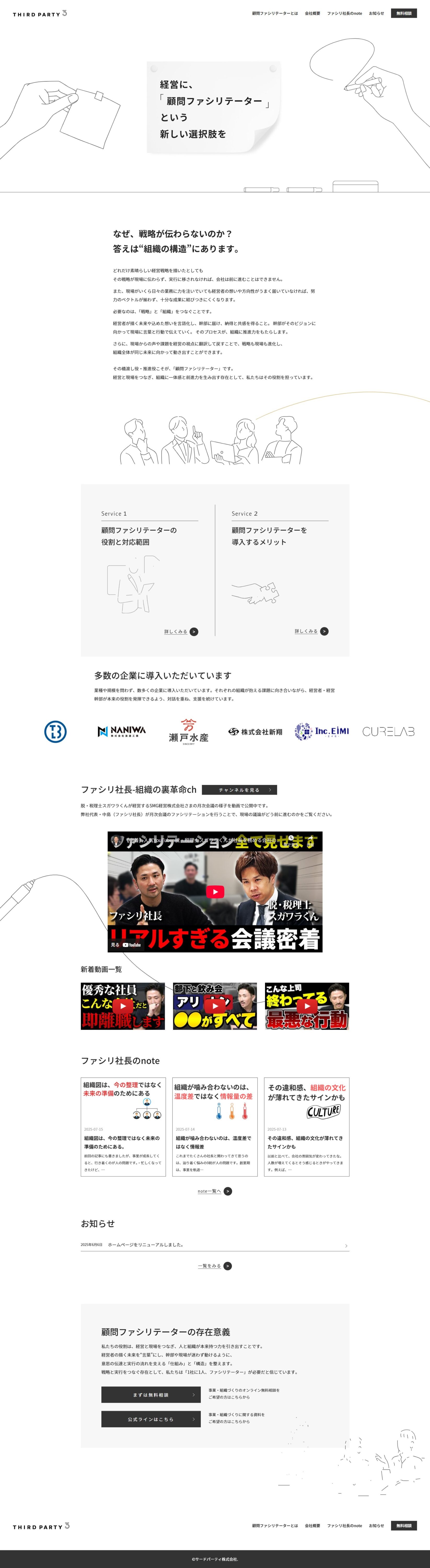 顧問ファシリテーターというサービスを中心に表現するため、ホワイトボードをコンセプトにしたデザインを採用し、付箋やボードにライティングしている様子をイメージしています。